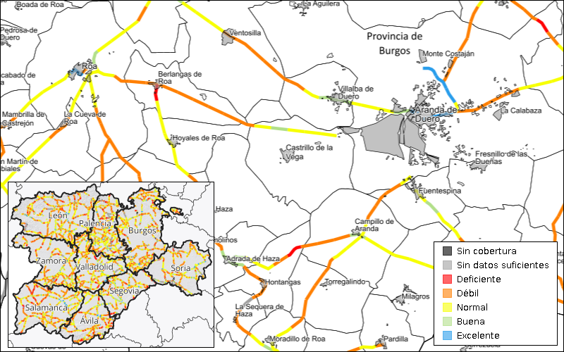 Análisis de la cobertura móvil de Castilla y León: Mapa de cobertura móvil en los tramos de carreteras regionales de Castilla y León en 2025.