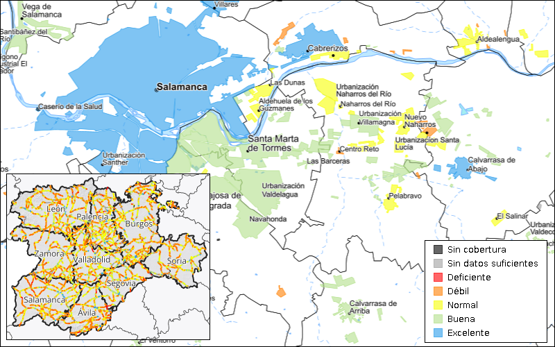- Datos geográficos obtenidos a partir de la cartografía de núcleos de población de la Junta de Castilla y León. Datos de cobertura adquiridos mediante suscripción externa para adquisición de base de datos de cobertura móvil GeoHash