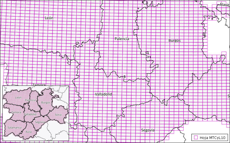 Rejilla cartográfica de distribución de hojas de mapa de la serie oficial de cartografía Mapa Topográfico de Castilla y León 1:10.000 (MTCyL10).