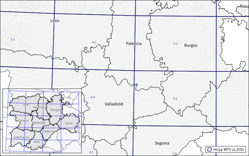 Rejilla cartográfica de distribución de hojas de mapa de la serie oficial de cartografía Mapa Topográfico de Castilla y León 1:200.000 (MTCyL200).