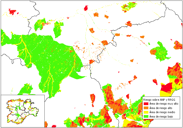 Mapa de riesgo de incendios forestales sobre áreas naturales protegidas (ANP) y recursos genéticos (RRGG) obtenido a partir del cruce de las áreas de peligro con la vulnerabilidad de las ANP y RRGG. Se clasifican como AR1- área de riesgo muy alto; AR2- área de riesgo alto AR3;- área de riesgo medio y AR4- área de riesgo baja.