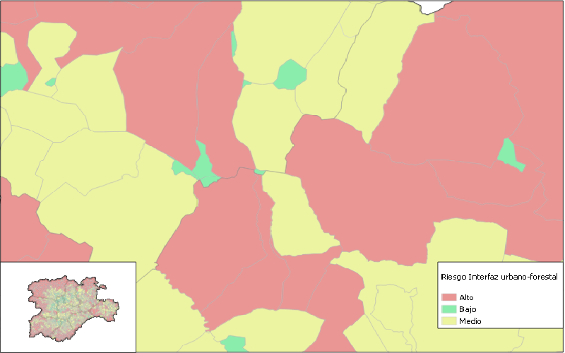 Mapa de riesgo de incendios de la interfaz Urbano-Forestal en asentamientos urbanos y rurales por término municipal del Plan Anual de Prevención, Vigilancia y Extinción de Incendios Forestales para el año 2026. Representación de los municipios por nivel de riesgo de interfaz urbano-forestal, siguiendo tres clasificaciones, alta, media y baja según la lista publicada en el Plan Especial de Protección Civil ante Emergencias por Incendios Forestales en Castilla y León (Plan INFOCAL), aprobado mediante el DECRETO 6/2025, de 27 de marzo del año 2025. * Aviso: VERSIÓN ANUAL DE DATOS CARTOGRÁFICOS
